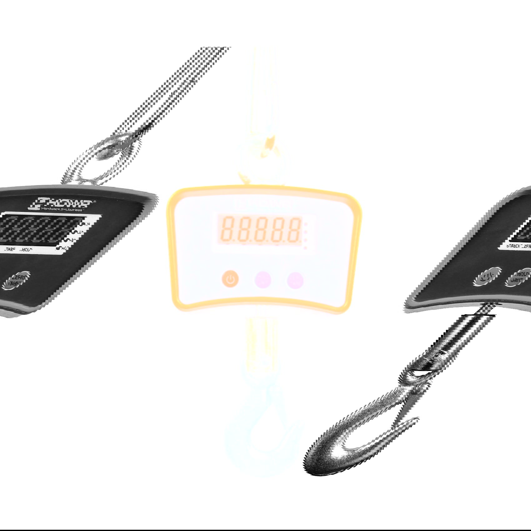 Das Gerät verfügt über ein stabiles orangefarbenes Gehäuse und erlaubt ein maximales Traggewicht von 1000 kg. Die zu wiegenden Objekte werden an einem speziellen Haken befestigt, der mit einer Sicherheitsverriegelung gegen Abrutschen gesichert ist. Das Wiegesystem bietet eine hohe Messgenauigkeit von bis zu 100 g und ist für Objekte mit einem Gewicht ab 0,5 kg geeignet.