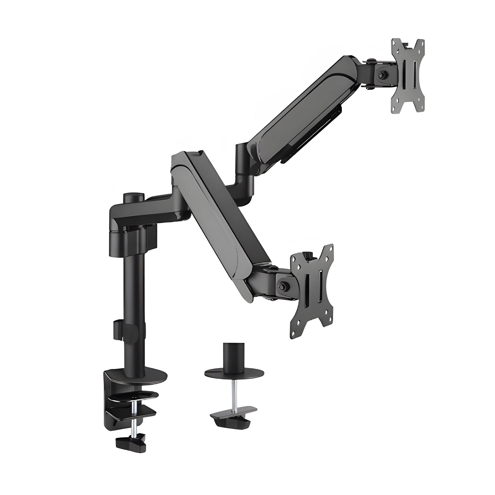 Die Arme der Halterung sind mit einer Gasfeder ausgestattet, die für eine reibungslose und präzise Einstellung des Monitors in der gewünschten Position sorgt. Das Werkzeug ermöglicht eine 180-Grad-Drehung jedes Arms, Neigung und Kippung entsprechend den individuellen Bedürfnissen. Eine große Erleichterung ist die Tilt-Funktion, die es ermöglicht, die Monitore um 90 Grad zu drehen und somit einen vertikalen Bildschirm zu erhalten. Die maximale Höhe des Arms beträgt 468 mm.