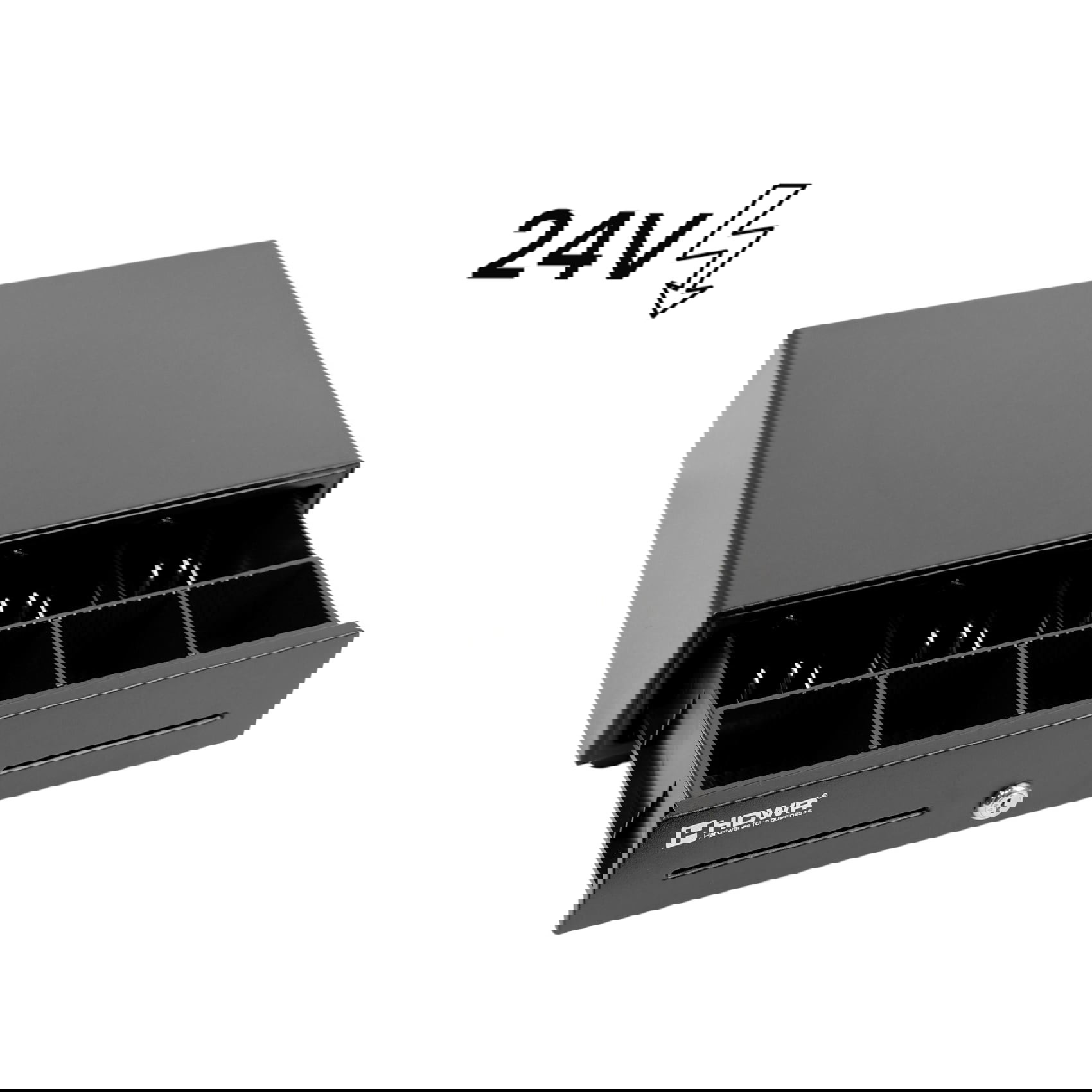 Die Öffnung erfolgt über ein Stationenschloss. Abschließbare Kassenschubladen bieten zusätzliche Sicherheit und schützen das Geld vor Diebstahl. Diese Schublade verfügt über ein Schlüsselschloss, um den Zugriff auf das Bargeld zu beschränken. Die Kassenschublade kann auf drei Arten geöffnet werden: mit einem Schlüssel, mit einem Nothebel oder elektronisch durch Anschluss an eine Registrierkasse über ein RJ12-Kabel. Die Spulenspannung beträgt 24V.
