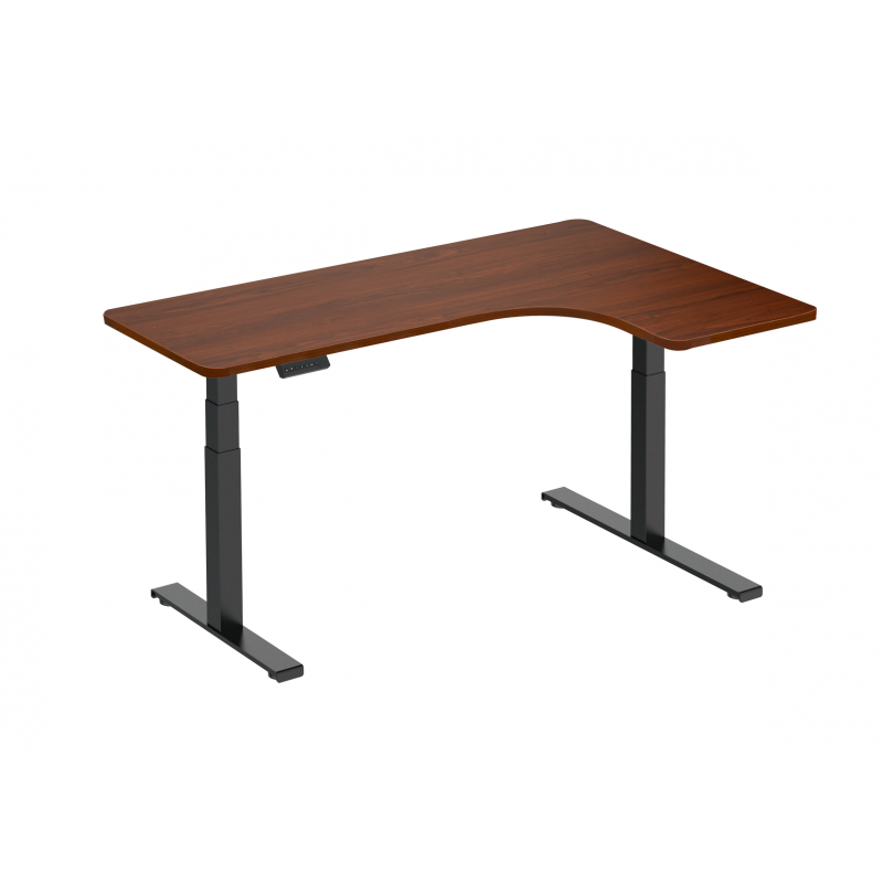 Der Eckschreibtisch deskTOP-23 mit elektrischer Höhenverstellung erfüllt perfekt die Bedürfnisse moderner Nutzer, die Wert auf Ergonomie, Komfort und stilvolles Design legen. Die Tischplatte in dunkler Walnussoptik mit Holzmaserung passt ideal zum schwarzen Gestell und wird sicherlich die Ästhetik des Raumes, in dem der Schreibtisch aufgestellt wird, bereichern. Der Eckschreibtisch bietet eine größere Arbeitsfläche als ein gerader Schreibtisch, sodass Sie ausreichend Platz haben, um einen bequemen und komfortablen Arbeitsplatz zu schaffen. Der verstellbare Schreibtisch kann nicht nur in der Ecke des Raumes, sondern überall aufgestellt werden und wird sich stets elegant und stilvoll präsentieren.
