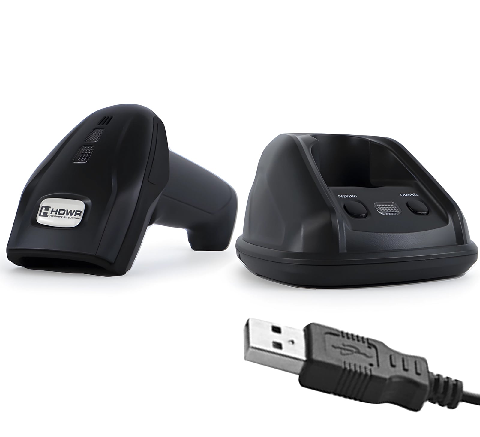 QR-Code-Scanner, Ladestation, USB-Kabel zur Station, Bedienungsanleitung.