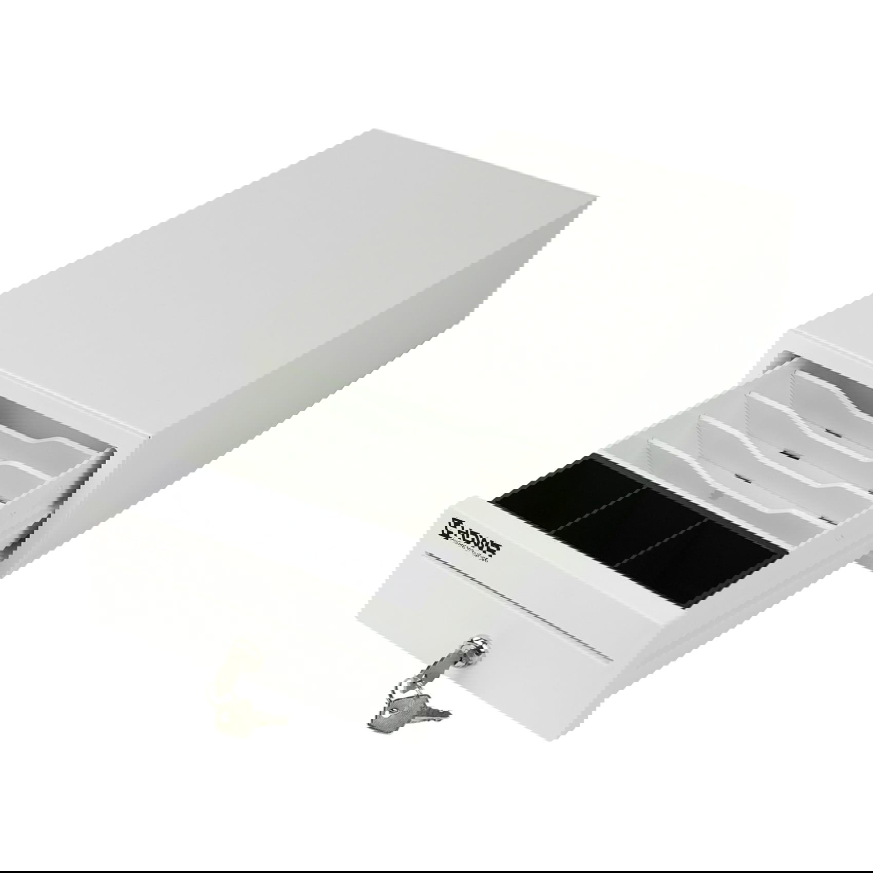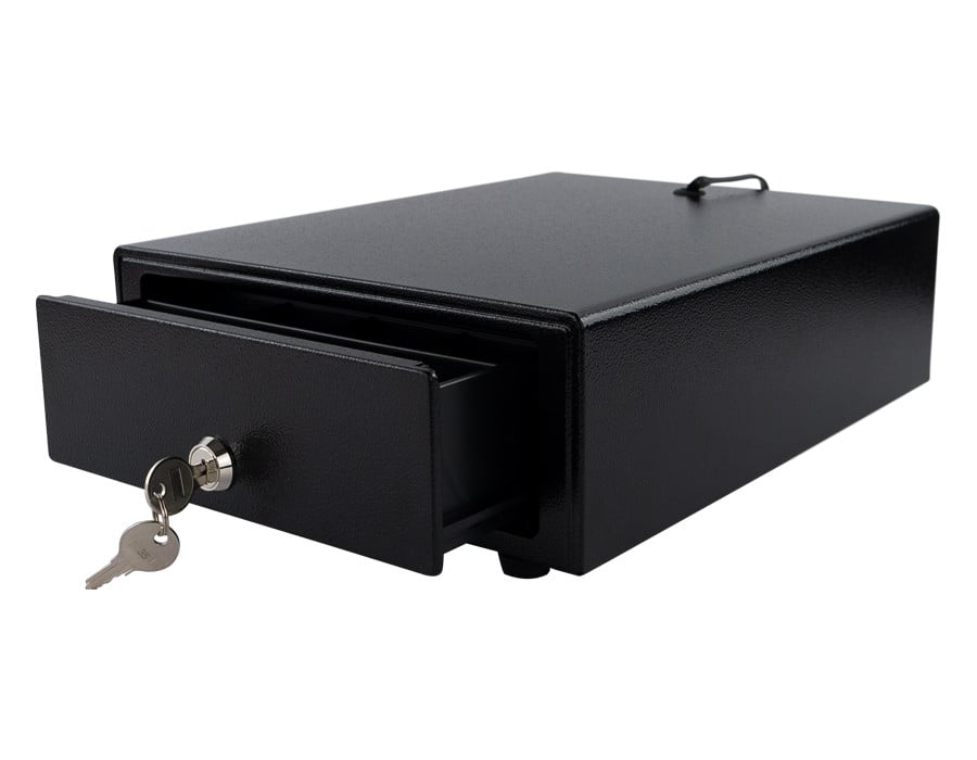 Die HD-KER20W bietet gleich drei Öffnungsarten: mit dem mitgelieferten Schlüssel, ferngesteuert über ein angeschlossenes Gerät (z. B. eine Registrierkasse) oder im Notfall per Hebel auf der Unterseite der Schublade.