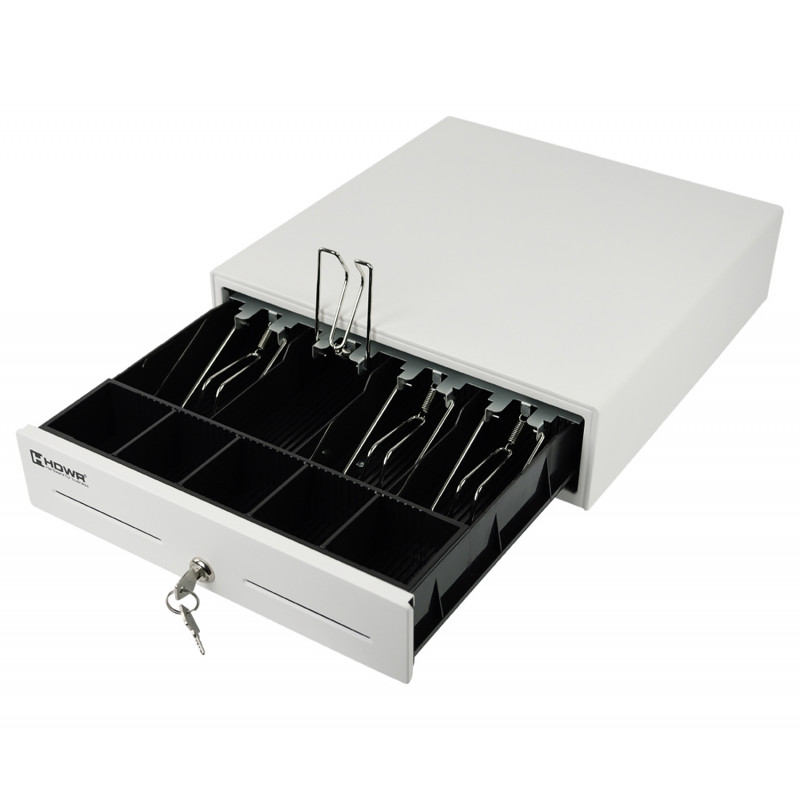 Die HD-KER33W ist eine elegante Kassenschublade, die für die sichere Aufbewahrung verschiedener Zahlungsmittel entwickelt wurde. Ihr Gehäuse besteht aus dickem, kaltgewalztem Stahl, was sie besonders langlebig und widerstandsfähig gegen Beschädigungen macht. Ein abschließbares Schloss schützt den Inhalt zuverlässig vor unbefugtem Zugriff.