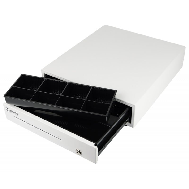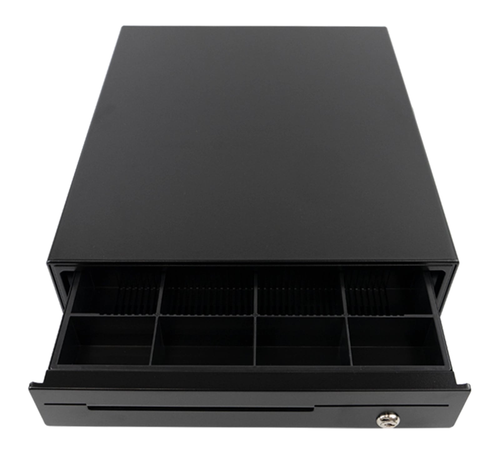 Die HD-KR35W lässt sich auf drei Arten öffnen: mit dem im Lieferumfang enthaltenen Schlüssel, im Notfall über den Hebel an der Unterseite oder elektronisch durch Anschluss an eine Registrierkasse über ein RJ12-Kabel. Dank der Unterstützung von 6/12V-Spulenspannung ist die Schublade mit verschiedenen Kassensystemen kompatibel.