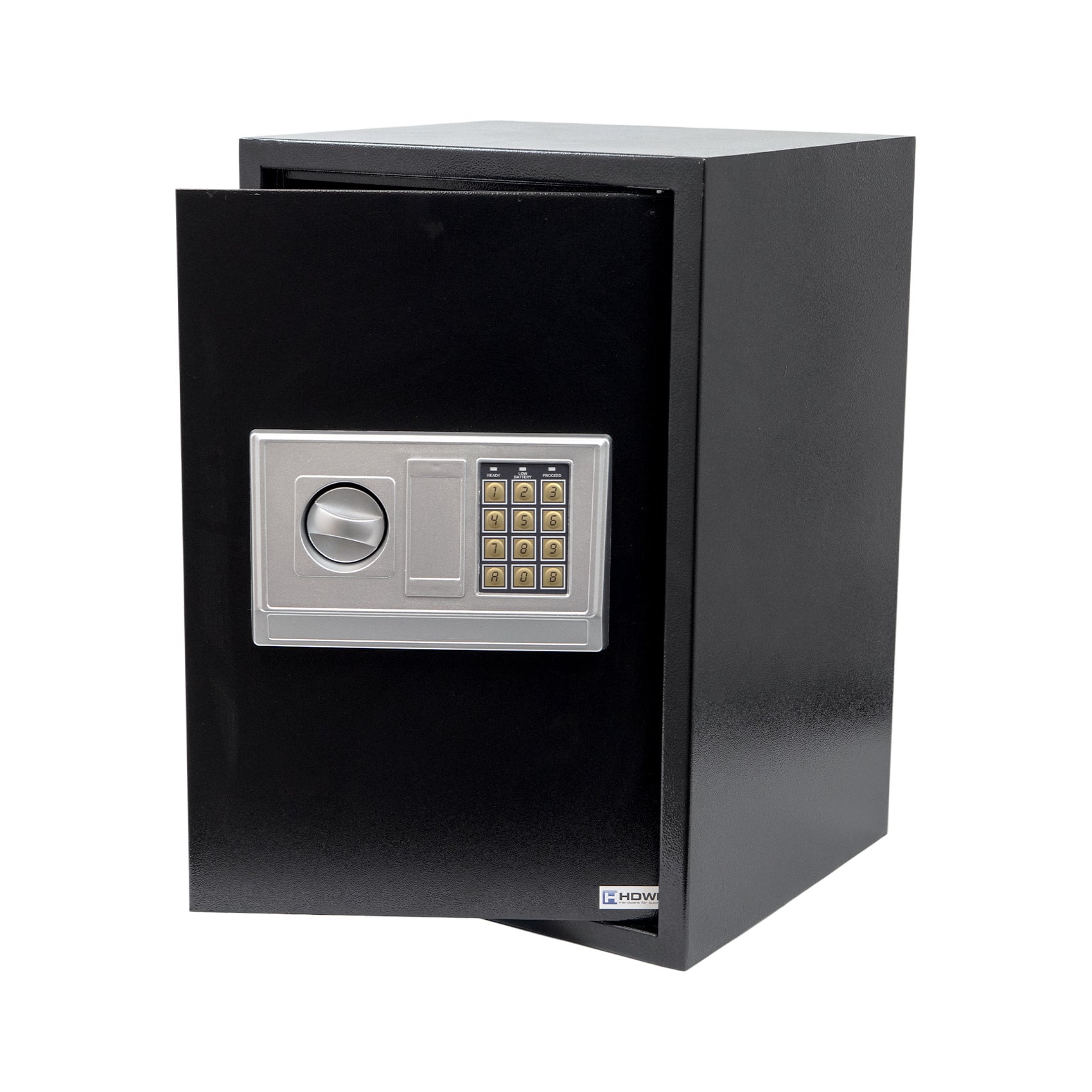Der Safe ist mit einem elektronischen PIN-Code-Schloss (3–8 Ziffern) ausgestattet, das nach Eingabe eines persönlichen Codes den schnellen Zugriff ermöglicht. Die Stromversorgung erfolgt über 4 × AA 1,5 V Batterien (nicht im Lieferumfang enthalten), bei Bedarf kann der Tresor auch mithilfe der beiliegenden Notfallschlüssel geöffnet werden. Für mehr Flexibilität ist das Modell mit einer herausnehmbaren Ablage versehen, wodurch das Innere individuell angepasst werden kann. Darüber hinaus verfügt der Tresor über Montagebohrungen und ein Schraubenset, sodass er fest an der Wand oder am Boden verankert werden kann – für noch mehr Sicherheit.