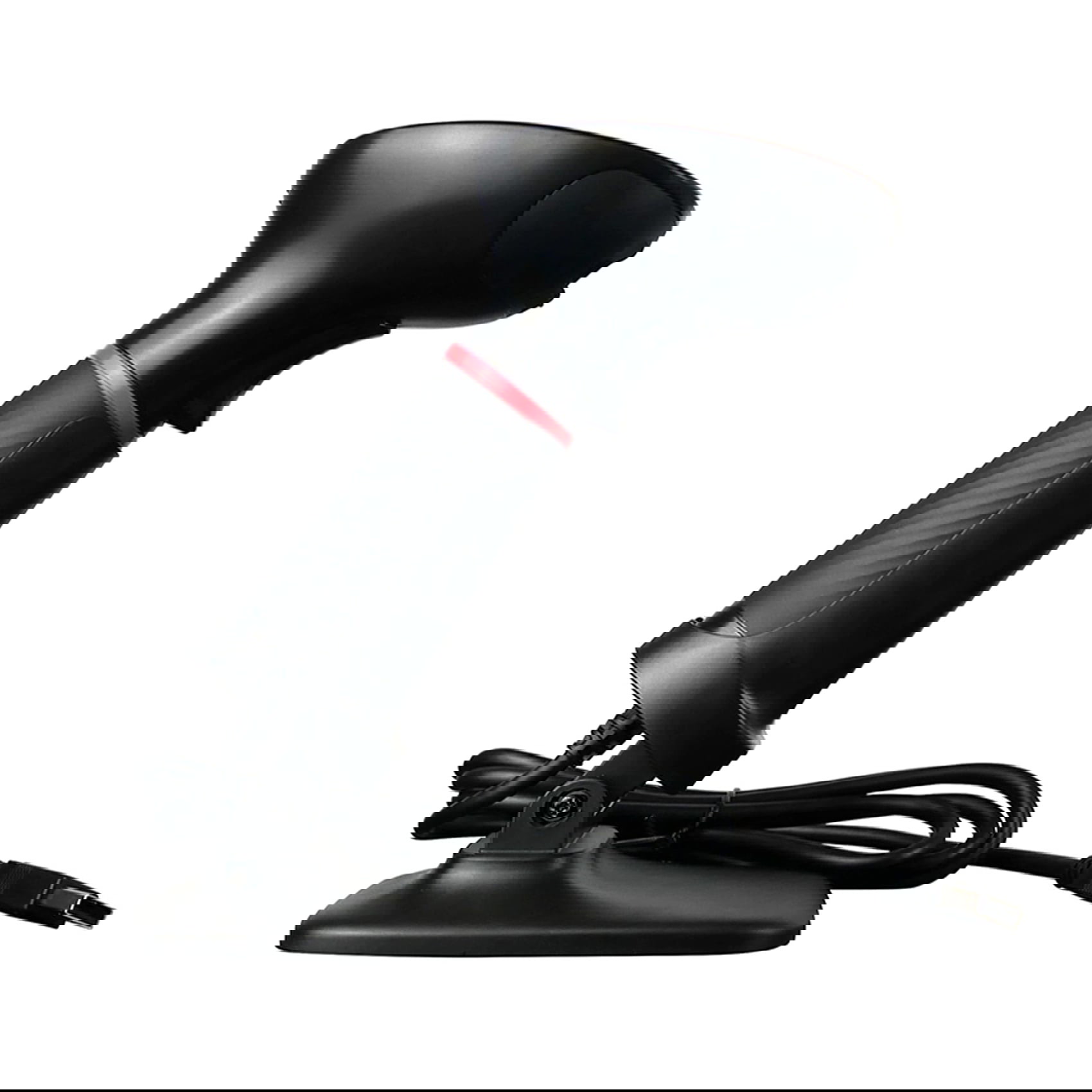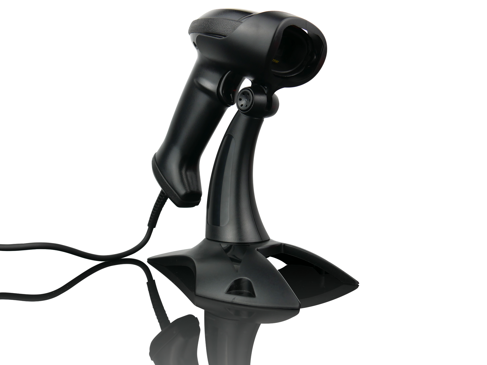 Kabelgebundener 2D-Scanner, fest verbautes USB-Kabel zur Verbindung mit dem PC, Scanner-Halterung, Bedienungsanleitung.