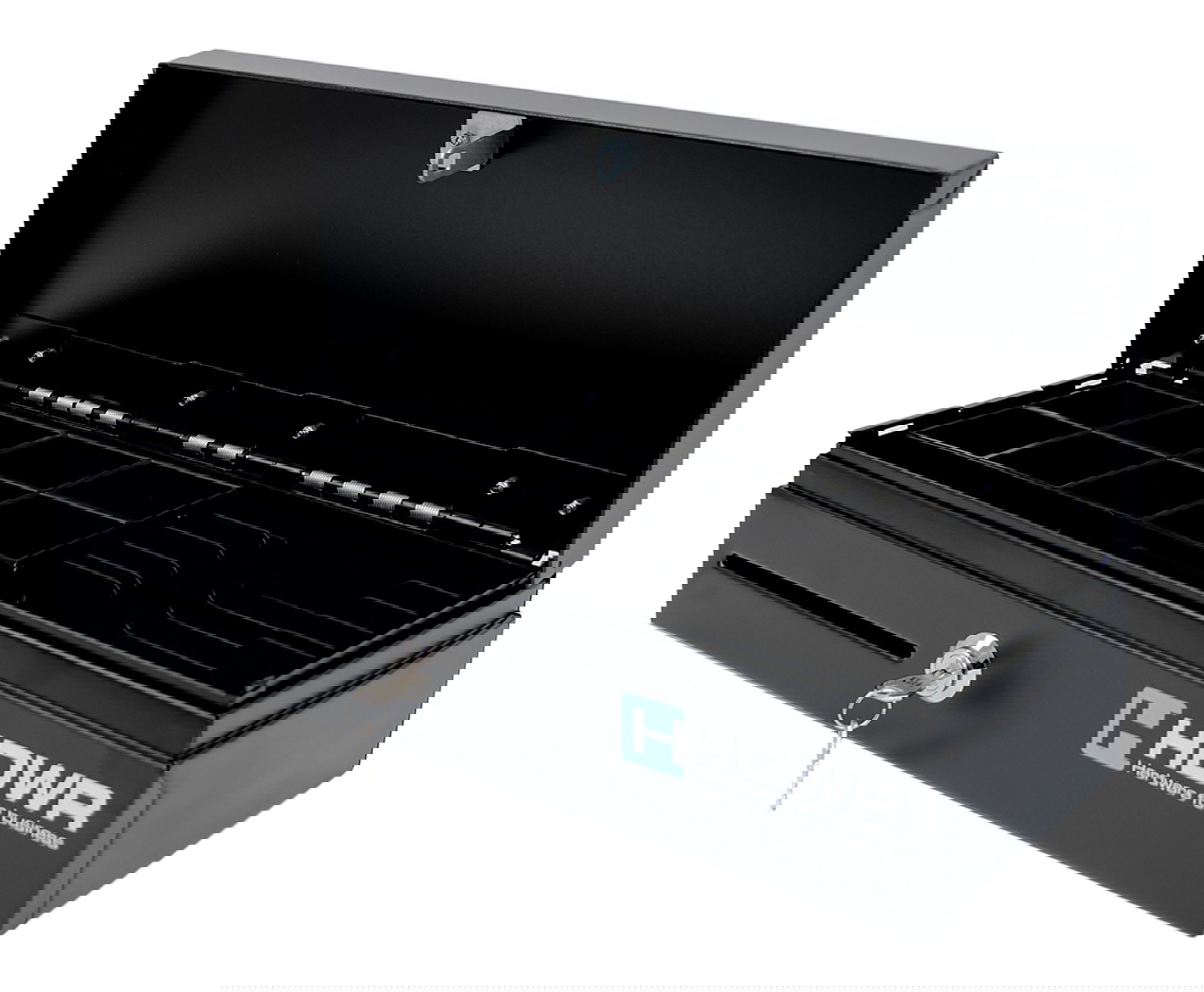 Die abschließbare Geldkassette securePRO-460S mit länglicher Form wurde aus dickem, kaltgewalztem Stahl gefertigt, was außergewöhnliche Langlebigkeit und Sicherheit der aufbewahrten Gelder gewährleistet. Die solide Konstruktion garantiert Widerstandsfähigkeit gegen Beschädigungen, und die elegante Ausführung in Schwarz mit silbernem Deckel, der von oben geöffnet wird, sorgt dafür, dass die Kassette in jedem Verkaufspunkt hervorragend aussieht. Eine ideale Lösung für Orte, an denen täglich große Mengen Bargeld verarbeitet werden.